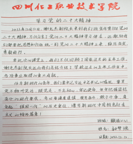 谢光杰对党的二十大报告宣讲让同学们备受鼓舞,倍感振奋。学生代表钟梦瑶结合学习体会,作了交流发言。会后同学们纷纷表示:作为川酒学院的学生,要将学习党的二十大精神作为今后一个时期的重要政治任务,牢记习近平总书记的殷殷嘱托,勤奋学习、精进专业技能,为全面建设社会主义现代化国家、全面推进中华民族伟大复兴而团结奋斗。