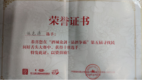 10月24日,由中国酒业协会主办,泸州市酒业发展促进局、泸州市龙马潭区人民政府、泸州市酒类行业协会承办的第十五届中国国际酒业博览会“酒城论剑·品酒争霸”第五届寻找民间好舌头大赛在步步高泸州新天地圆满落幕。共有1000余人参加比赛,我院食品营养与检测专业1831班学生徐忠涛荣获“十佳民间好舌头”称号。