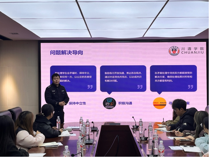 12月2日,为提升学生会干部应对矛盾冲突的能力,维护校园和谐稳定,我院特邀请黄舣镇罗警官为学生会全体成员开展了一场别开生面的矛盾冲突处理培训。