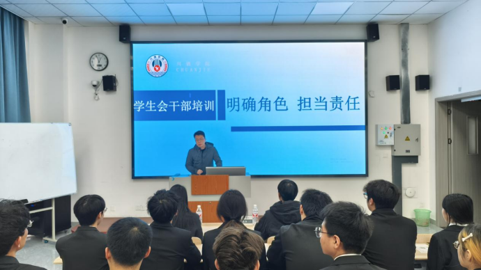 为加强学生会干部队伍建设,提升学生干部综合素质与服务意识,川酒学院于12月4日开展了学生会干部培训活动。川酒学院直属党支部书记唐德兵出席并担任主讲人,学生会全体干部成员积极参与。