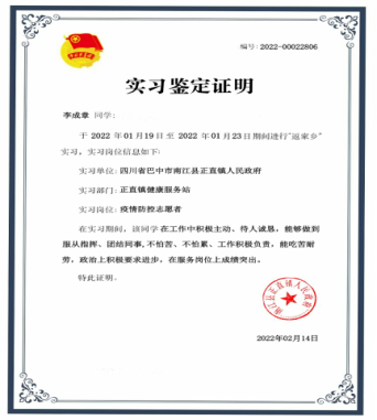 酿酒技术2131班学生李成章:在四川省巴中市南江县正直镇高速路口进行三必须工作,对外来的车辆、人员,查验健康信息、测量体温做登记等等日常的防疫工作。