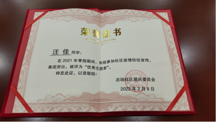 食品检测2132班汪佳同学:在况场社区街道对公众进行扫场所码的宣传对返乡人员进行摸排检查;协助报备人员进行扫码;整理返乡人员的核酸报告,进行分类,排序;记录中高风险人员14天体温,登记在册。