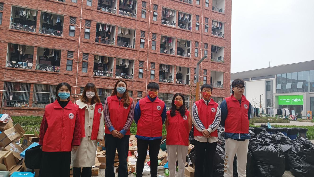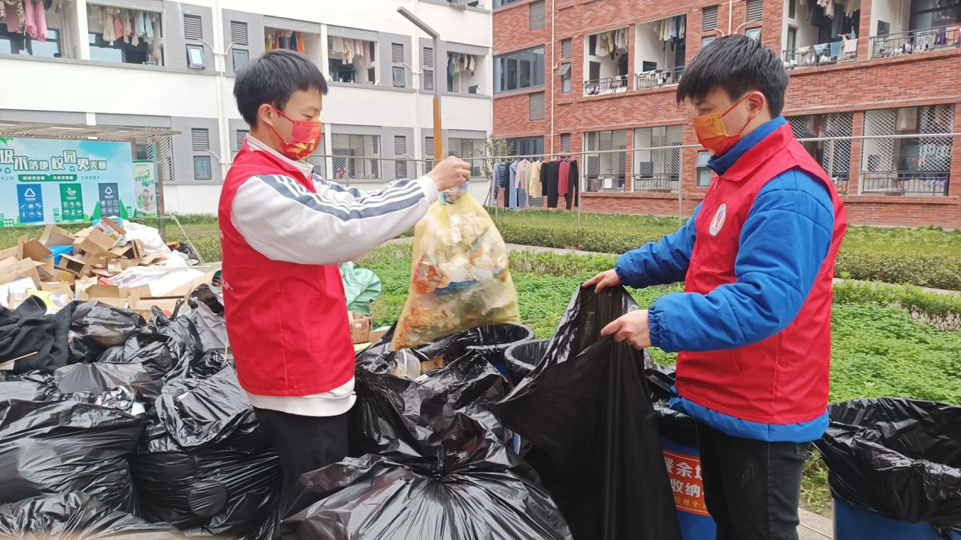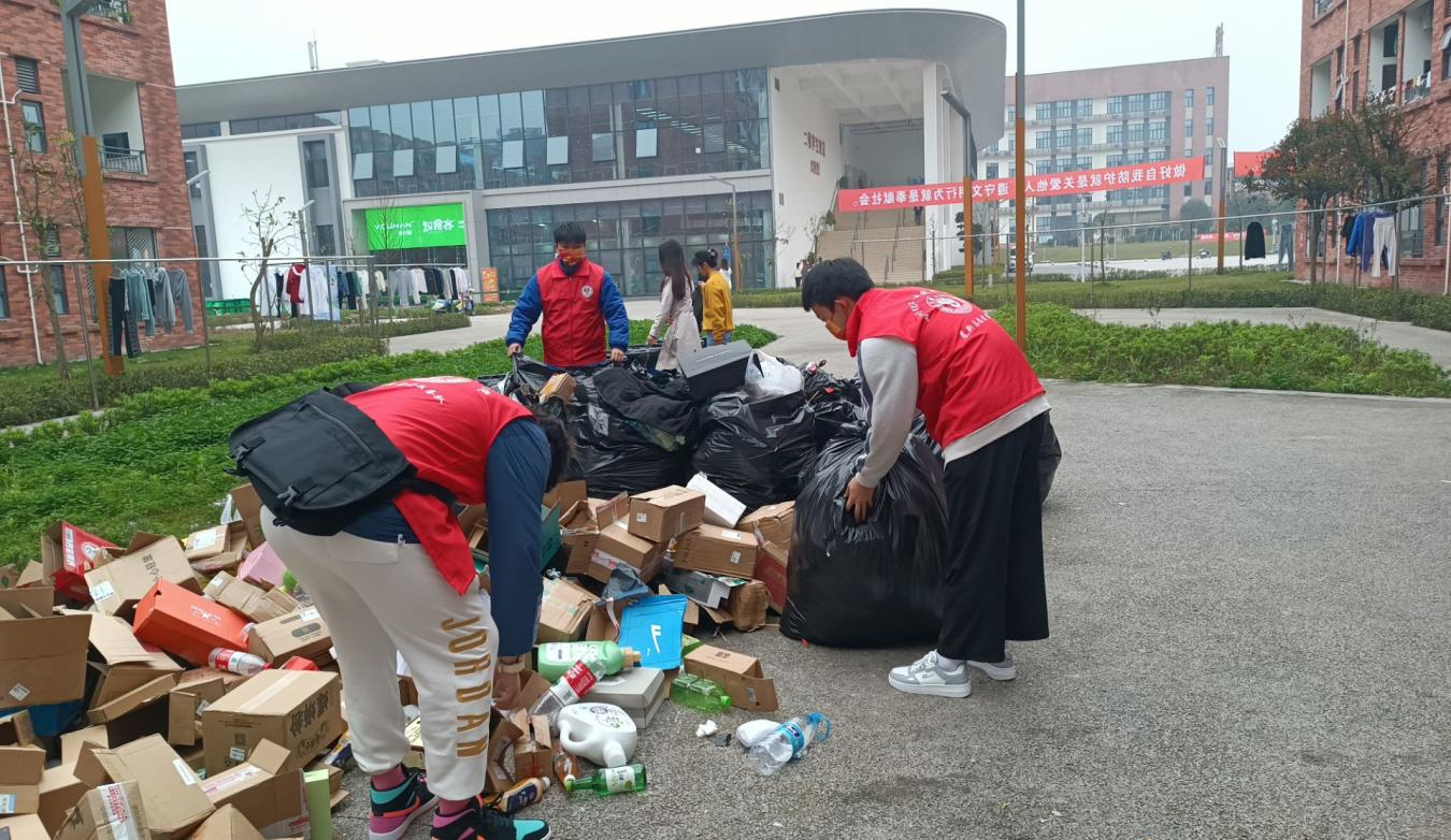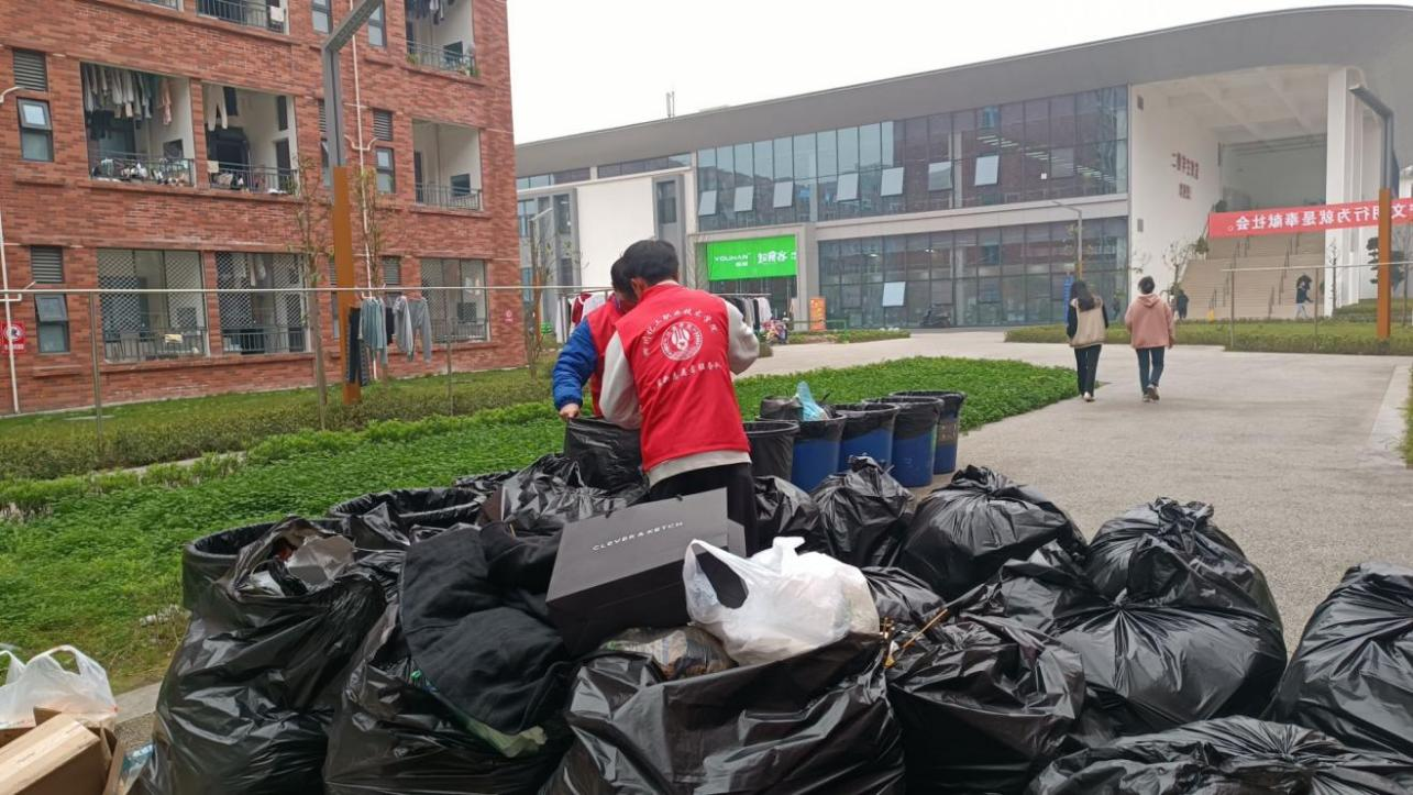 晨光熹微,川酒学院的志愿者们早早来到了学校各栋寝室楼下,帮助环卫阿姨清理散落垃圾,分类打包整理,一些可以回收利用的纸壳,单独放置。将垃圾袋排列好后堆放到指定地点。