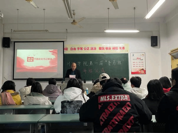 2.代团总支书记计涛老师出席仪式,给第一期青马班全体学员深情寄语。每位青年学生在这个大有可为的年龄都应加强自己的政治理论水平,培养自己的家国情怀,从而实现以“青年兴”促进“国家兴”,以“青年强”实现“国家强”的目标。在学习马克思主义时要力争做到肩负使命学,筑牢思想防线;带着问题学,践行知行合一;紧跟时代学,做到学以致用。希望每一位青马班学员最终成为一名马克思主义的坚定信仰者、忠实实践者和有力传播者。