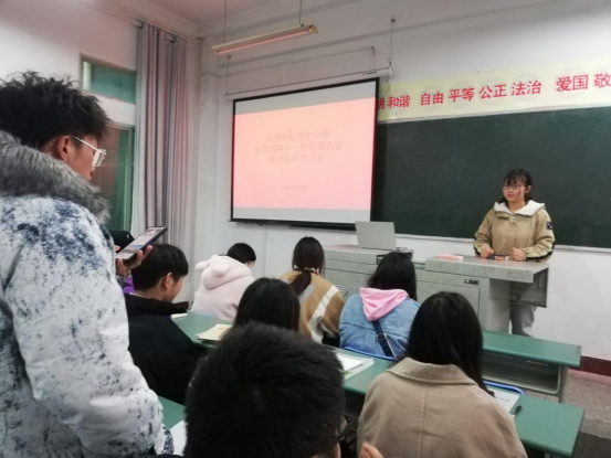 2.学生会副主席李豪宣讲四川省学联第十一次代表大会开幕式发言,了解了在疫情期间学联在党的领导下做出的贡献,以及领导对学联近几年的成绩的肯定和表扬,并清楚领导对青年学生未来的期望与要求,希望青年学生能成长为民族的未来、祖国的希望。