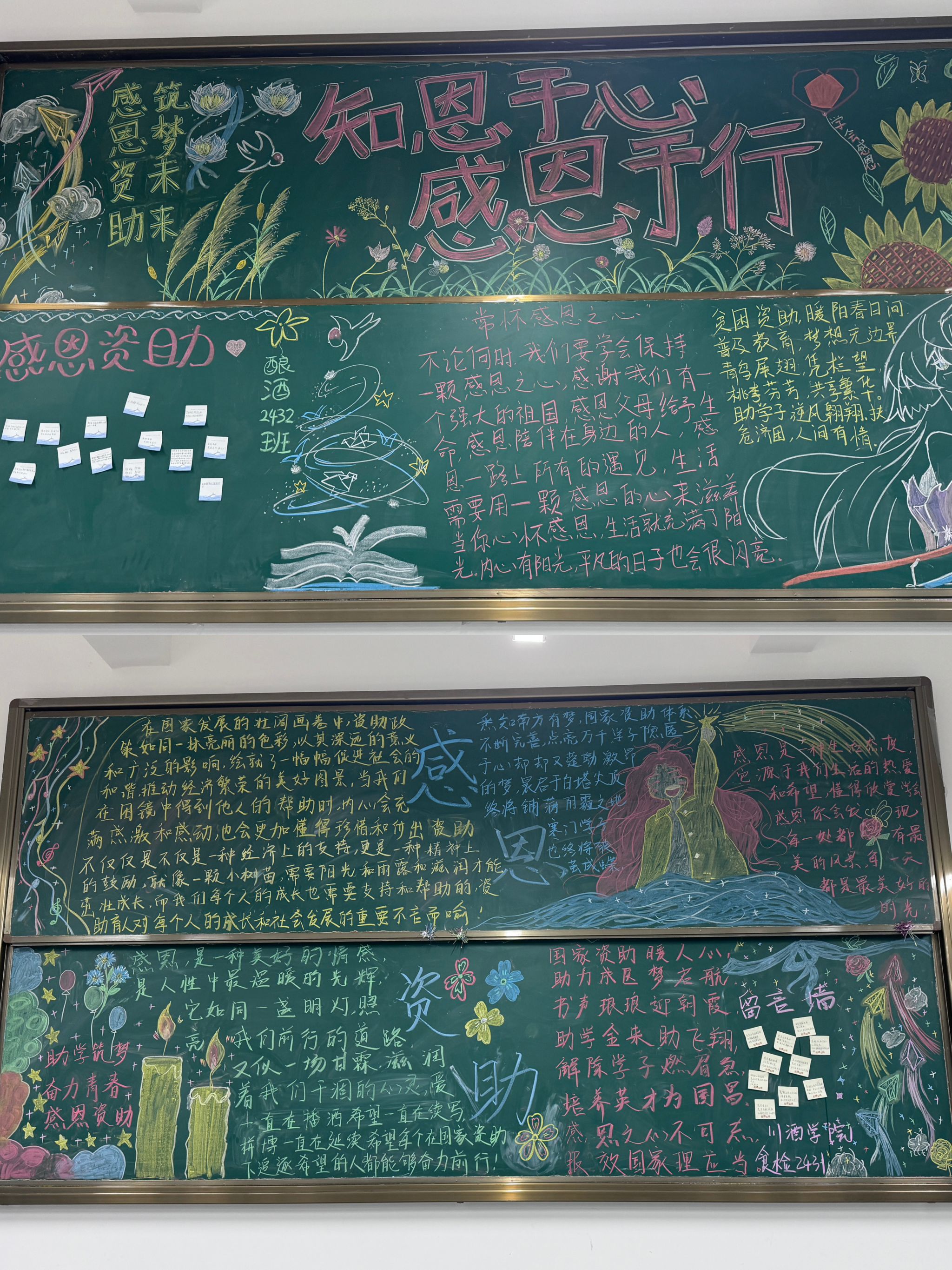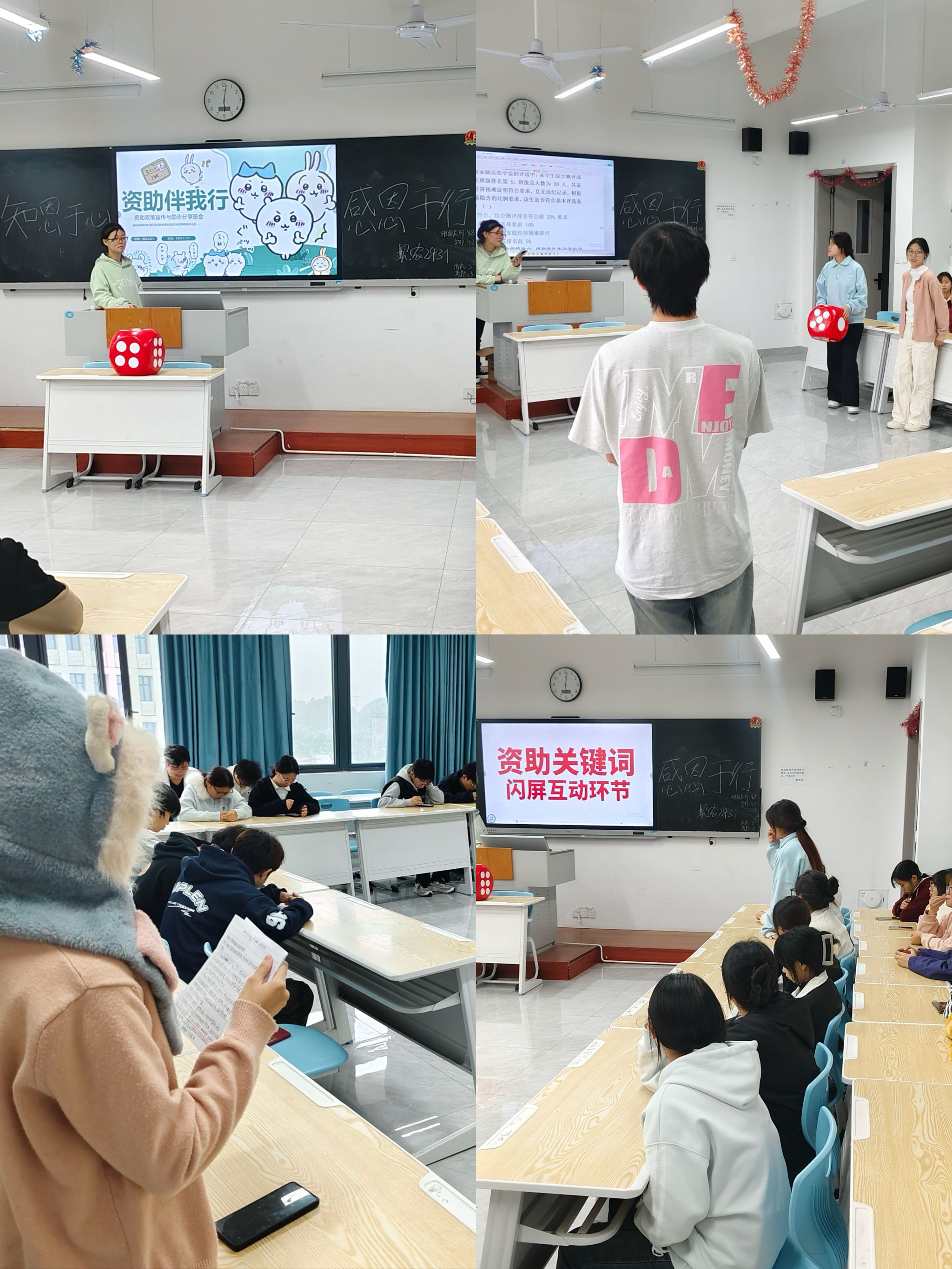 各班级精心组织了形式多样的互动活动:有的班级齐唱《感恩的心》,在动人的旋律中激发情感共鸣;有的班级邀请受助学生代表分享成长故事,以身边榜样鼓舞奋进力量;有的班级精心绘制感恩主题黑板报,营造浓厚的育人氛围;还有班级开展“资助宣讲·情暖社区”活动,将关怀延伸至更广泛的群体,彰显资助育人的温暖与力量。