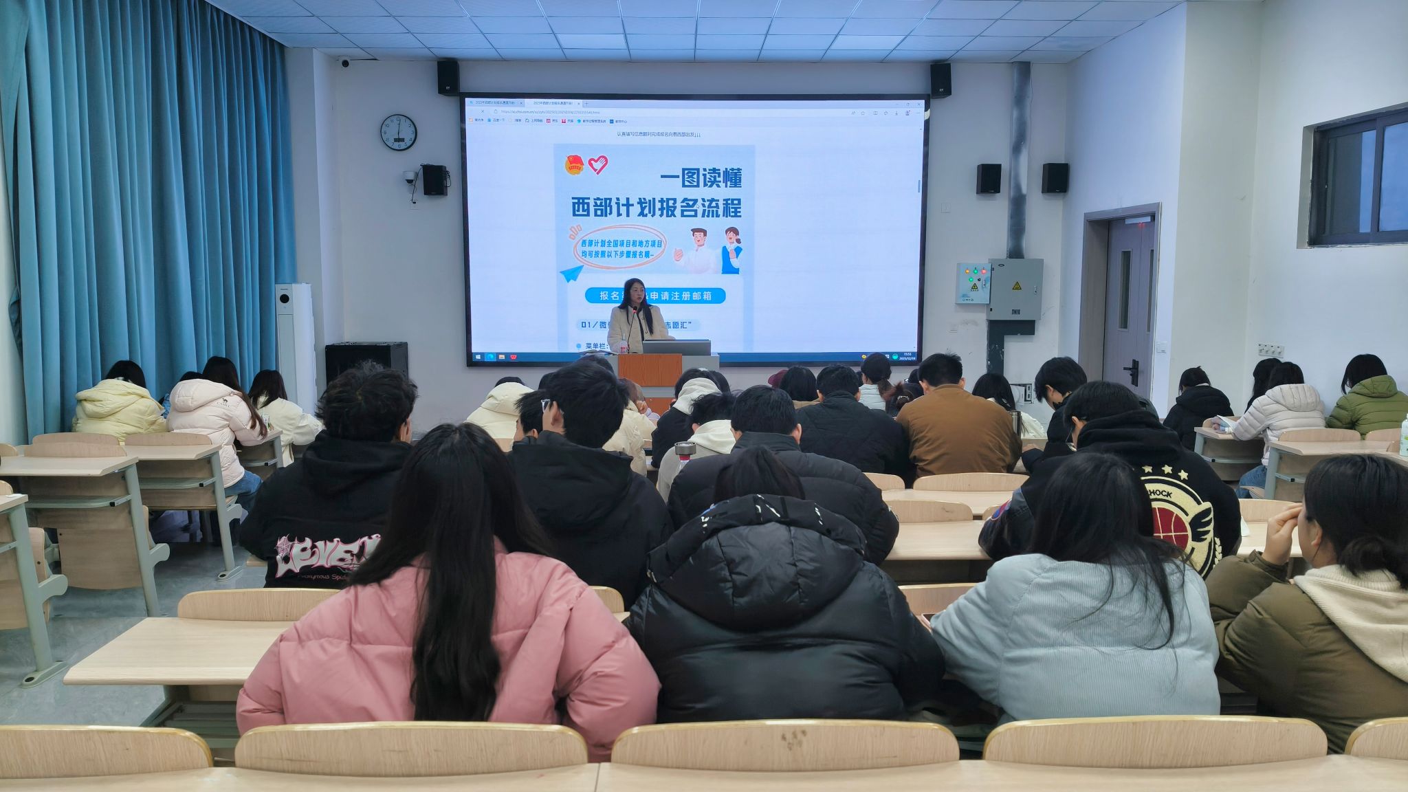 宣讲会上,刘易娜老师系统介绍了西部计划的项目背景、招募条件、服务内容与政策保障。她结合往届志愿者在支教助学、支农惠农、基层治理、乡村振兴等岗位的生动事迹,诠释了“到西部去、到基层去、到祖国最需要的地方去”的时代内涵。