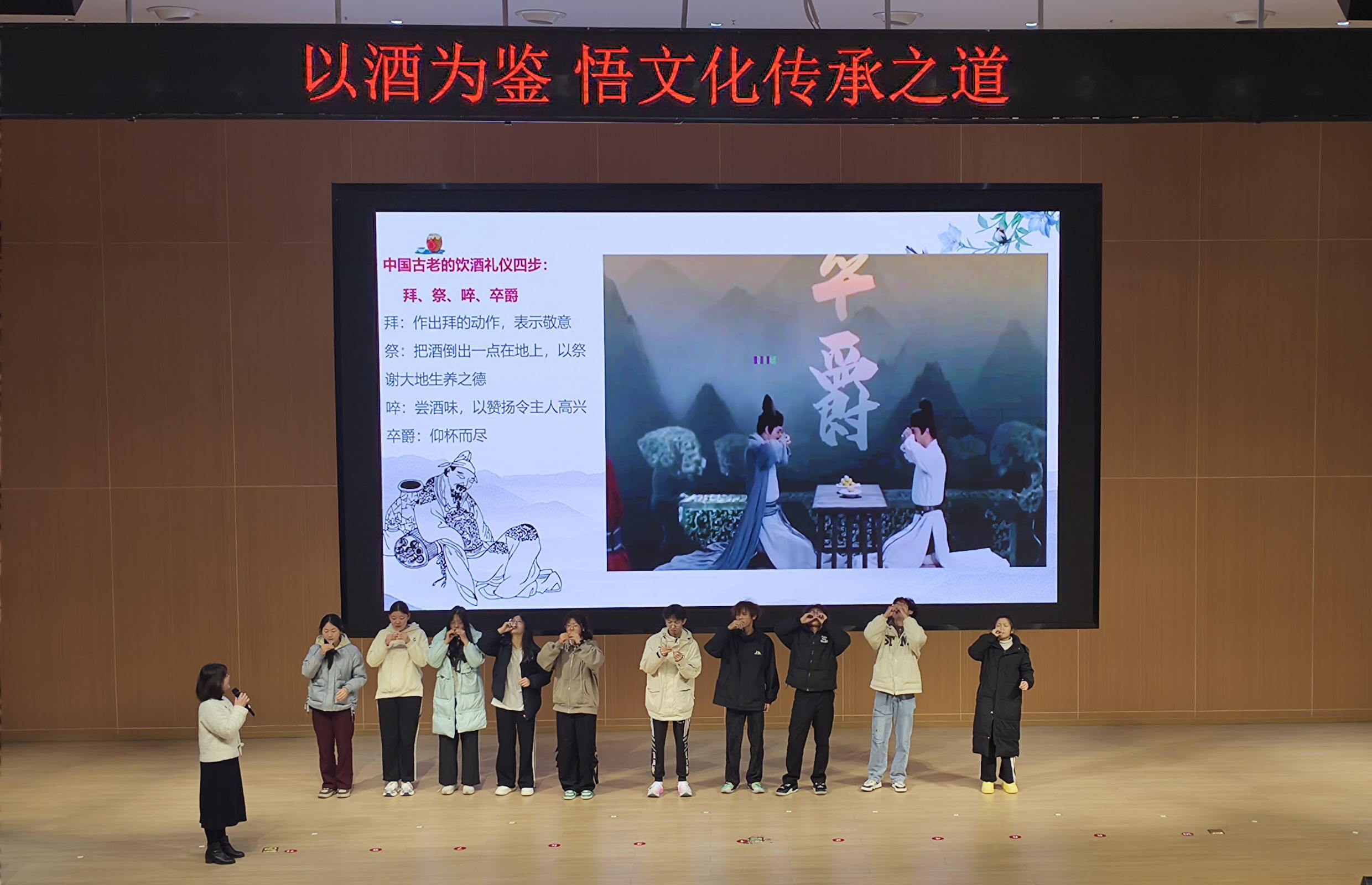 在深入讲解酒文化的过程中,着重介绍了饮酒礼仪四个步骤,即“拜、祭、啐、卒爵”。为了让同学们更直观地感受和理解传统酒文化礼仪,讲座设置了互动环节,现场邀请了10位同学上台参与饮酒礼仪四部曲的体验,同学们积极参与,收获颇丰。酿酒专业2024级学生潘金玉分享了自己的感受:“第一次系统了解到酒文化背后蕴含的礼仪规范,今后在专业实践中会更加注重文明素养的培养。”