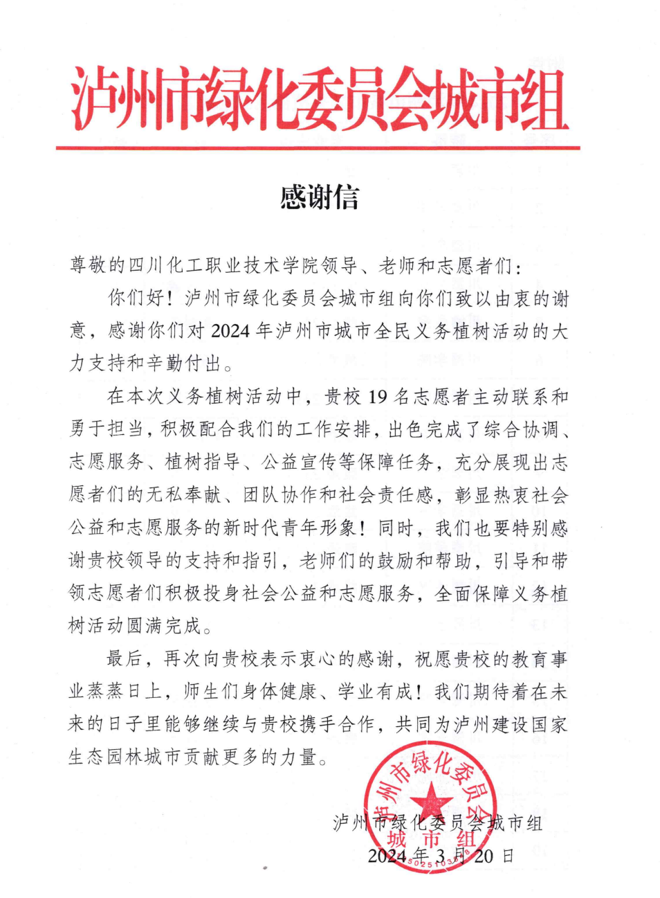 近日,泸州市绿化委员会城市组发来一份感谢信,信中对四川化工职业技术学院川酒学院19名志愿者在“相约春天,为国家生态园林城市充‘植’”活动中的志愿服务表现做出高度赞扬。