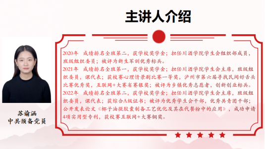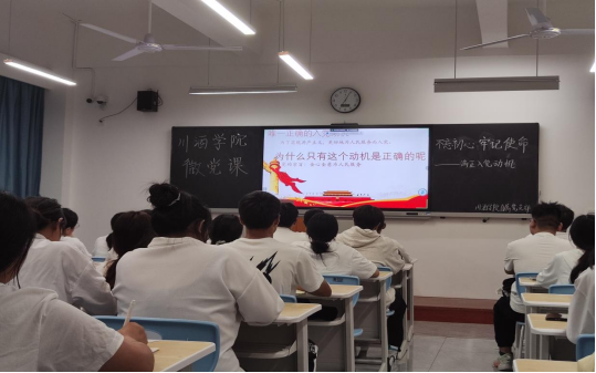 “为什么要端正入党动机?”“如何端正入党动机?”5月9日晚,在酒谷湖校区醇学楼413教室,川酒学院直属党支部学生预备党员苏谕涵为我院全体入党积极分子集中上了一堂题为“端正入党动机,永葆赤诚之心”的线上微党课。此次微党课由川酒学院学生党务中心负责人汪佳主持。